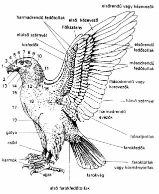 1. ábra. A madár testtájékai és tollazata. Testtájékok: 1. felsô csôrkáva,