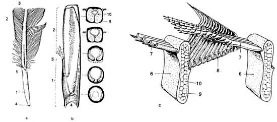 2. ábra. A madár tollazatának szerkezete. a) a galamb evezôtolla, b) a