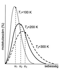 23. ábra. Azonos számú molekulát tartalmazó ideális gáz sebességeloszlása különbözö hömérsékleteken
