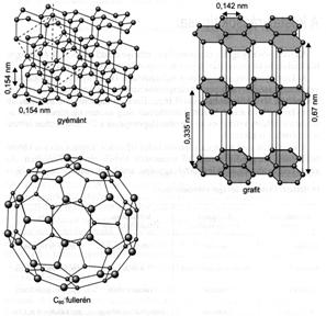 28. ábra. A gyémánt és a grafit kristályrácsa, valamint a C60 fullerén