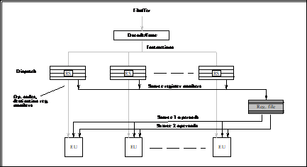 R10000 (ábra - 7.100): két buszon keresztül történik az utasítások kiküldése. Az egyik a fixpontoshoz, a másik a FP és gyökvonáshoz. Az FP osztás 20-40 ciklusig tart. Ez egy buszról táplálva, nem hoz érdemi teljesítménycsökkenést, mivel a FP utasítások aránya 10% még a müszaki programokban is.