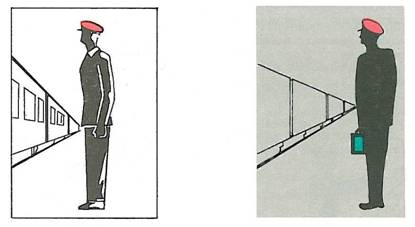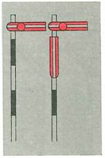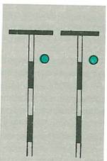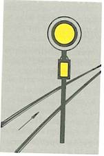 Az egyszerű váltók jelzései gyakorlatilag megegyeznek a MÁV-nál alkalmazottakkal, de akkor, amikor a váltó csúccsal szemben haladó menetek részére kitérő irányban áll, nem fehér nyíl látható, hanem két, egyik végén összetartó fehér téglalap, amely jelzi, hogy a váltó jobbra, vagy balra terel (20. ábra). |