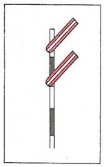 A váltó jobb kitérő irányba áll - fekete alapon két, egyik végén összetartó fehér téglalap a kitérés irányába.(24. ábra)