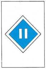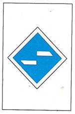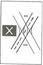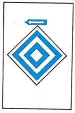 Csúcsára állított kék négyzet merőlegesen a vágányra.
