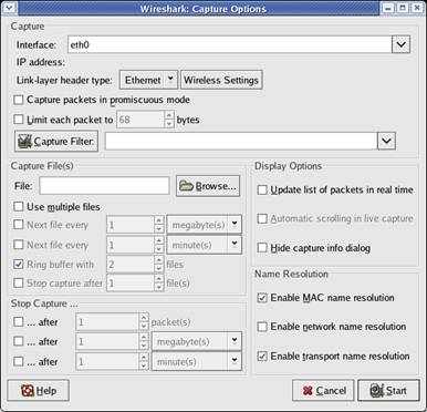A dialógusablak Interface mezőjében megadhatjuk a vizsgálandó hálózati interfészt. Az eth0 interfész a Linux rendszerek első ethernet interfészét jelenti. A vizsgálataink folyamán ennek az interfésznek a forgalmát figyeljük.