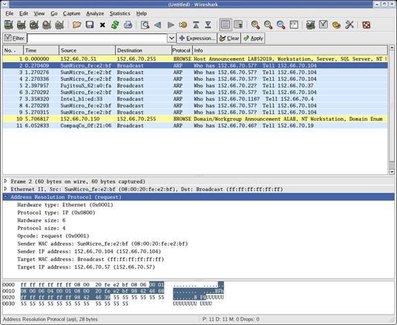 Amennyiben a számítógépünkön nem futattunk semmilyen hálózaton forgalmazó programot, 848j97i akkor is gépünk folyamatosan kap hálózati csomagokat. Ezek broadcast csomagok, többnyire ARP címlekérések, illetve ha MS Windowst használó gépek is vannak a hálózaton, akkor SMB csomagok. A monitorozás kipróbálására ezeket a csomagokat fogjuk megvizsgálni.