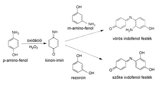 Ezek a festékek csak a hajjal együtt távoznak a fejről. Kis molekulákból állnak, például fenilén-diaminokból, amino-fenolokból és rezorcinból, amelyek behatolnak a haj belsejébe. A molekulák nem színesek, és az első mosásra lesodródnának a hajról. Hogy ezt megakadályozzák, és "megfessék" őket, oxidálószert, rendszerint hidrogén-peroxidot (H2O2) is adnak a készítményhez. A hidrogén-peroxid a p-fenilén-diamint kinon-diiminné, a p-amino-fenolt kinon-iminné oxidálja. Ezek a molekulák a hajfesték többi komponensével színes festékmolekulákat alkotnak (l. következõ ábra). A keletkező festékmolekulák túl nagyok ahhoz, hogy kijussanak a kéregrétegből, tehát a haj színe megmarad.