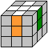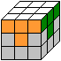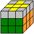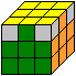 Ez leírva szavakkal: A két rosszat szemben és jobbra tartjuk magunktól, úgy, hogy a sárga közép felfelé néz! Felhozunk egy 6-os blokkot a szemközti oldalra, úgy, hogy a szemközti oldalon csak a bal szélső sáv ne legyen fehér! Ebből a 6-os blokkból csinálunk egy fordított L betűt, méghozzá a következő képpen: Elfordítjuk a tetejét (Óra mutató járása szerint), majd a jobb oldalról a 2 fehér színt letesszük alulra és végül visszafordítjuk a tetejét. Most hogy megvan a fordított L, levisszük az L betű szárát (középső sort) alulra. Most visszafordítjuk a kockánkat úgy, hogy a fehér szín felfelé nézzen, majd berakjuk a hiányzó sarkot az 1.)-es pontban leírtak szerint!