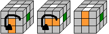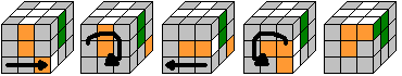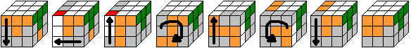 Fordítsuk úgy a kockát, hogy az adott sarokkocka velünk szemben a jobb oldalon legyen, majd fordítsuk el a jobb oldalát a kockának magunk felé. Ekkor a sarokkockánk lekerült az alsó sorra. Az alsó sort fordítsuk el az óramutató járásával ellentétesen (innentől visszafelé), majd a jobb oldalt fordítsuk magunktól elfelé. Ezzel a mozdulatsorral kihoztuk az a), b) vagy a c) eset valamelyikét!