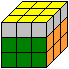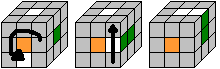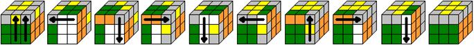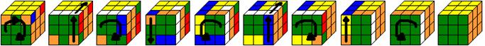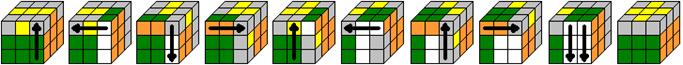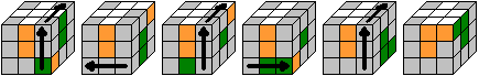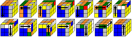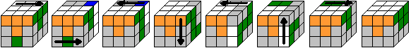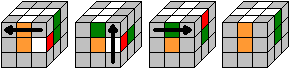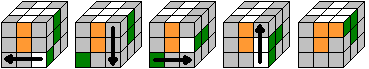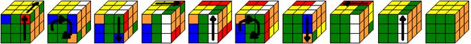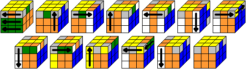 Szavakkal leírva: Tartsuk a két kicserélni való élkockát szemben és balra! Most fordítsuk a jobb oldalt fel és a tetejét jobbra, majd a bal oldalt fel és a tetejét balra! Most a jobb oldalon szemben kell 3 fehérnek lennie, azokat tegyük le az alsó sorra! Fordítsunk a tetején kettőt, majd a bal oldalt fordítsuk lefelé! Ezek után a tetejét fordítsuk jobbra, a bal oldalt fordítsuk hátrafelé, ezzel visszajött a szemközti oldalra balra 2 fehér, amihez a teteje elfordításával ( 2 fordítás) állítsuk oda a 3. fehéret, majd végül ezt a kész 3-as fehéret fordítsuk le a többi fehérhez!