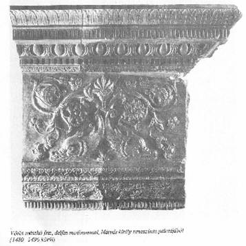 Mátyás király is az öseihez hasonlóan használ delfinmintákat. Ez a lelet nem Esztergomban, hanem a Budai várban látható[ii][ii].