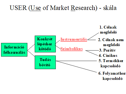 Menon & Wilcox (1994) kifejezetten a piackutatásból származó információk feldolgozásának egységes mérése érdekében dolgozta ki az ún. USER (Use of Research) skálát. A USER-skála az információ felhasználás fogalmát - a hagyományosan elfogadott instrumentális, fogalmi és szimbolikus dimenziókhoz képest - tágabban értelmezi a piackutatások esetében.