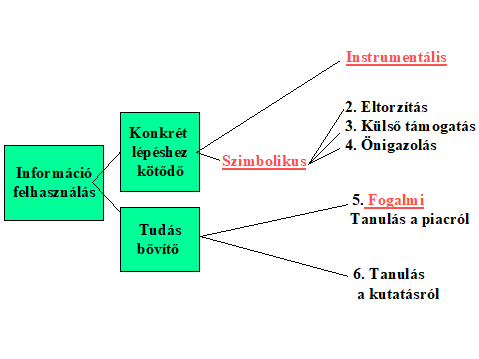 Az információ felhasználást vizsgáló tanulmányokban a szerzök (pl.: Deshpandé-Zaltman (1982, 1984, 1987), (Diamantopulos & Souchon 1995), (Homburg & Karlhaus 1998)) különbséget tesznek az információ felhasználás 1.) instrumentális (instrumental), 2.) fogalmi (conceptual) és 3.) szimbolikus (symbolic) módja, dimenziója között.