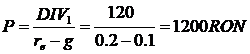 3. Egy részvény idei osztalékát, 60 RON-t holnap fogják kifizetni a részvény tulajdonosának. Ez az érték az elörejelzések szerint évi 12%-al fog növekedni. Az elvárható éves hozam (kalkulatív kamatláb) 15%. Mekkora az elméleti árfolyam?