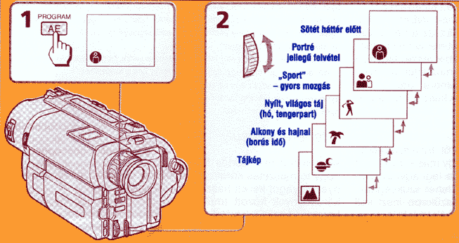 A legtöbb mai kamkordernél - a témának megfelelő funkciójú - vezérlő programot tudunk választani a Program AE (Auto Exposure) gombbal. Illusztrációként választott kameránk esetében ezek a Program AE nyomógombbal választhatók ki.